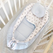 SNS Baby - Babynestje en Hoofdkussen - Organische Katoen - Antibacterieel Babynestje - Anti-Allergisch Babynestje - Blue Moon Star-patroon - Lux Orthopedisch - 74 x 40 cm