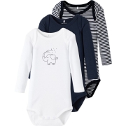 Een 3-pack rompertjes voor baby’s van het merk Name It, gemaakt van biologisch katoen, modaal en elastaan. Het aansluitende rompertje heeft een ronde hals met een kanten detail, lange mouwen en een…