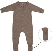 Boxpakje van merinowol - bruin gemêleerd De zachte wollen stof zit heel comforatbel een geeft jouw kindje volop bewegingsvrijhied. De fijne omslag van dit boxpakje bij de voetjes…