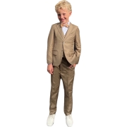 Chique 4-delig bruidsjonker / communie kostuum. De kleur van het kostuum is bruin /beige. Dit jongens kostuum bestaat uit een gevoerd jasje, broek, overhemd en gilletje. De broek heeft in de…