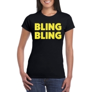 Verkleed T-shirt voor dames in de kleur zwart met geel glitter opdruk. Op dit shirt staat de tekst: Bling bling. Leuk party t-shirt met gele glitter tekst om te dragen tijdens een glitter en…