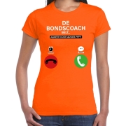 Verkleed T-shirt voor dames in de kleur oranje. Het shirt is bedrukt met de tekst: De bondscoach belt...alweer voor advies pfff. Met een ophang en opnemen knop van een telefoon, en daar boven de…