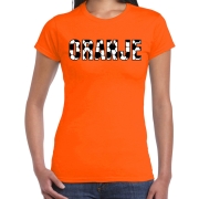 Oranje supporter T-shirt voor dames in de kleur oranje. Het shirt is bedrukt met de tekst: Oranje, met een voetbalpatroon in de letters. Steel de show bij de plaatselijke kroeg met dit leuke…