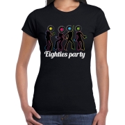Verkleed t-shirt voor dames in de kleur zwart. Dit leuke t-shirt is bedrukt met de tekst: Eighties Party en dansende figuren met LP platen als hoofd. Heb jij binnenkort een foute party, carnaval…