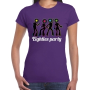 Verkleed t-shirt voor dames in de kleur paars. Dit leuke t-shirt is bedrukt met de tekst: Eighties Party en dansende figuren met LP platen als hoofd. Heb jij binnenkort een foute party, carnaval…