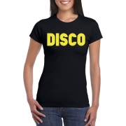 Verkleed t-shirt voor dames in de kleur zwart met geel glitter opdruk, Dit leuke t-shirt is bedrukt met de tekst: Disco. Heb jij binnenkort een disco/jaren 70/80 thema feestje, foute party of…