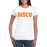 Verkleed t-shirt voor dames in de kleur wit met oranje glitter opdruk, Dit leuke t-shirt is bedrukt met de tekst: Disco. Heb jij binnenkort een disco/jaren 70/80 thema feestje, foute party of…
