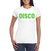 Verkleed t-shirt voor dames in de kleur wit met groen glitter opdruk, Dit leuke t-shirt is bedrukt met de tekst: Disco. Heb jij binnenkort een disco/jaren 70/80 thema feestje, foute party of…