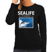 Dolfijn sweater / trui met dieren foto sealife of the world zwart voor dames. Deze trui is bedrukt met een foto van een Dolfijn met de tekst: sealife of the world. Een gave sweater voor een echte…