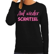 Wintersport verkleed sweater voor dames in de kleur zwart met glitterbedrukking. Deze leuke trui is bedrukt met de tekst: "Auf wieder SCHNITZEL" in sprankelend glitter roze. Deze Après Ski Sweater…