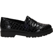 Stijlvolle lakzwarte Rieker instapper. De instapper heeft een mooie dierenprint en combineer je makkelijk met al je outfits. Deze schoen heeft een voetbed gemaakt van leer.…