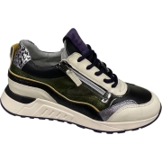 Met deze lage sneakers 2507-14 van Piedi Nudi ben jij helemaal on-trend! De sneaker bestaat uit zwart leer met panelen van beige leer en heeft overlays van groene, zwarte en paarse glitters. De…