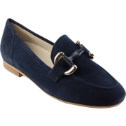 Instapper van Gabor in koblat blauw suède op een soepele honingkleurige rubberzool met een klein hakje. Over de wreef van artikel 45.213.18 is een opengewerkte sierband bevestigd. De loafer is…