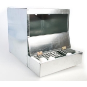 Gegalvaniseerd legnest voor kippen. De bodem van dit nest bestaat uit een schuinaflopend rooster waarop de kip haar ei legt. Als de kip het nest verlaat, rolt het ei over het rooster in een…
