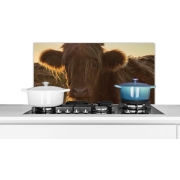 Keukenaccessoires - Schotse Hooglander - Zonsondergang - Gras - Achterwand keuken Keuken spatschermen van KitchenYeah beschermen jouw kookplaat achterwand tegen spetters en etensresten.…