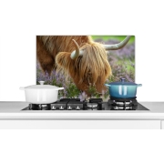 Spatscherm Keuken - Kookplaat Achterwand - Spatwand Fornuis - 60x40 cm - Schotse Hooglander - Hoorns - Heide - Aluminium - Wanddecoratie - Muurbeschermer - Hittebestendig