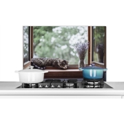 Spatscherm Keuken - Kookplaat Achterwand - Spatwand Fornuis - 90x60 cm - Cyperse kat uit het raam - Aluminium - Wanddecoratie - Muurbeschermer - Hittebestendig