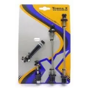 TranzX quickrelease set Specificaties:Kleur: zwartMateriaal: aluminium, staalType fiets: ATB/MTB, racefietsGewicht set : 155 gramLengte voor: 110 mm…