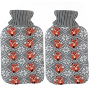 Warmwaterkruiken 2 liter met zachte gebreide vossen print hoes grijs 2x stuks -