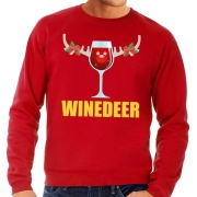 Foute kersttrui Winedeer in het rood, voor heren. De kerst sweater is bedrukt met een afbeelding van een wijntje met een gewei en een rode neus. Deze kersttrui/ sweater/ sweatshirt is van dun…
