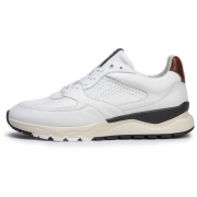 Sneaker van Floris van Bommel in wit (print)leer met een donkerbruin hielstuk op een ecru met zwarte chunky rubberzool met op het loopvlak een zwart, wit en blauw vlak voorzien van profiel. De…