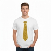 Feest shirt glitter/VIP/gala thema. Val op tijdens elke gelegenheid met dit feestelijke heren T-shirt met stropdas print in goud glitter. Het shirt is voorzien van een opvallende glitter and…