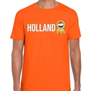 Verkleed T-shirt voor heren in de kleur oranje. Het shirt is bedrukt met de tekst: Holland. Naast de tekst staat een lintje bedrukt met de vlag van Nederland waarop de tekst "Champions" staat. Heb…
