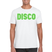 Verkleed t-shirt voor heren in de kleur wit met groen glitter opdruk, Dit leuke t-shirt is bedrukt met de tekst: Disco. Heb jij binnenkort een foute party, carnaval of disco/jaren 70/80 thema…