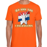 Verkleed T-shirt voor heren in de kleur oranje. Het shirt is bedrukt met de tekst: We are the champions! Met de vlag van Nederland. Heb je binnenkort een voetbal wedstrijd of een ander sport…