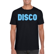 Verkleed t-shirt voor heren in de kleur zwart met blauw glitter opdruk, Dit leuke t-shirt is bedrukt met de tekst: Disco. Heb jij binnenkort een foute party, carnaval of disco/jaren 70/80 thema…