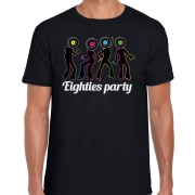 Verkleed t-shirt voor heren in de kleur zwart. Dit leuke t-shirt is bedrukt met de tekst: Eighties Party en dansende figuren met LP platen als hoofd. Heb jij binnenkort een foute party, carnaval…