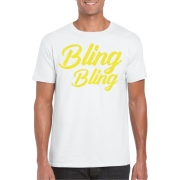 Verkleed T-shirt voor heren in de kleur wit met glitter opdruk in de kleur geel. Op dit shirt staat de tekst: Bling bling. Een leuk bedrukt t-shirt met glitter tekst om te dragen naar bijvoorbeeld…