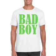 Foute party t-shirt voor heren in de kleur wit met glitterbedrukking in de kleur groen. Het t-shirt is bedrukt met de tekst: Bad Boy. Ga jij binnenkort naar een foute party, carnaval of…