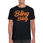 Verkleed T-shirt voor heren in de kleur zwart met glitter opdruk in de kleur oranje. Op dit shirt staat de tekst: Bling bling. Een leuk bedrukt t-shirt met glitter tekst om te dragen naar…