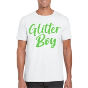 Verkleed T-shirt voor heren in de kleur wit met groen glitter opdruk. Op het shirt staat de tekst: glitter boy. Heb jij binnenkort een feestje, carnaval of thema feest? Dan is dit shirt onmisbaar…