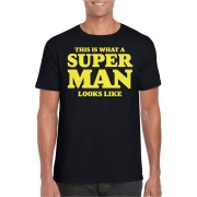 Verkleed T-shirt voor heren in de kleur zwart met glitter opdruk in de kleur geel. Dit leuke T-shirt is bedrukt met de tekst: This is What a Super Man Look Like. Heb jij binnenkort een foute party…