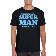 Verkleed T-shirt voor heren in de kleur zwart met glitter opdruk in de kleur blauw. Dit leuke T-shirt is bedrukt met de tekst: This is What a Super Man Look Like. Heb jij binnenkort een foute…