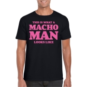 Foute party t-shirt voor heren in de kleur zwart met glitterbedrukking in de kleur roze. Het t-shirt is bedrukt met de tekst: This is What A Macho Man Looks Like. Ga jij binnenkort naar een foute…