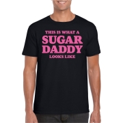 Verkleed T-shirt voor heren in de kleur zwart met glitter opdruk in de kleur roze. Dit leuke T-shirt is bedrukt met de tekst: This is What a sugar daddy Looks Like. Heb jij binnenkort een foute…