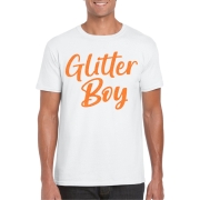 Verkleed T-shirt voor heren in de kleur wit met oranje glitter opdruk. Op het shirt staat de tekst: glitter boy. Heb jij binnenkort een feestje, carnaval of thema feest? Dan is dit shirt onmisbaar…