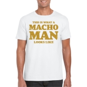 Foute party t-shirt voor heren in de kleur wit met glitterbedrukking in de kleur goud. Het t-shirt is bedrukt met de tekst: This is What A Macho Man Looks Like. Ga jij binnenkort naar een foute…