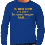 Wintersport verkleed sweater voor heren in de kleur blauw met glitterbedrukking. Deze leuke trui is bedrukt met de tekst: "Ik heb hier geen actieve herinneringen aan" in sprankelend glitter goud.…