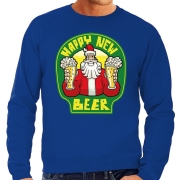 Grote maten foute Kersttrui nieuwjaar / Kersttrui happy new beer / bier blauw voor heren. Deze Kerst trui / sweater is bedrukt met de afbeelding van een proostende kerstman met 2 pullen / glazen…