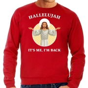 Hallelujah it's me i'm back Kerstsweater / outfit rood voor heren. Deze Kerstsweater / trui is bedrukt met Jezus en de tekst: HALLELUJAH IT'S ME I'M BACK. Deze Kerstsweater / Kerst trui is leuke…