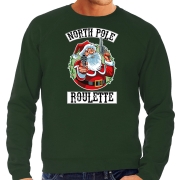 Foute Kerstsweater / outfit Northpole roulette groen voor heren. Deze Kerst sweater / trui is bedrukt met een Kerstman met 2 pistolen en de tekst: NORTHPOLE ROULETTE. Deze Kerstsweater / Kerst…