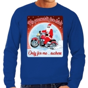 Foute no presents for kids blauw voor heren. Deze Kerst trui / sweater is bedrukt met de afbeelding van de kerstman op een motor en de tekst: No Presents for Kids Only for me....Suckers. Deze…