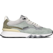 Deze lage sneaker SFM-10159 van FLORIS VAN BOMMEL is gemaakt van wit leer met verschillende overlays van wit leer en grijs met groen suède. Opvallend is de tong van geweven textiel, de witte leren…