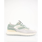 Deze lage sneaker SFM-10159 van FLORIS VAN BOMMEL is gemaakt van wit leer met verschillende overlays van wit leer en grijs met groen suède. Opvallend is de tong van geweven textiel, de witte leren…