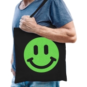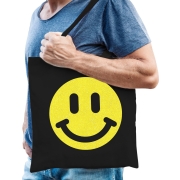 Cadeau tas voor dames - glitter Smile Emoticon - zwart - katoen - 42 x 38 cm - Moederdag - verjaarda -