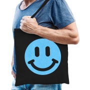 Katoenen cadeau tas voor heren in de kleur zwart. De shopper is eenzijdig bedrukt met: een smiley, in blauwe glitter. Geef dit leuke tasje cadeau voor Vaderdag, zijn verjaardag of gewoon zomaar om…